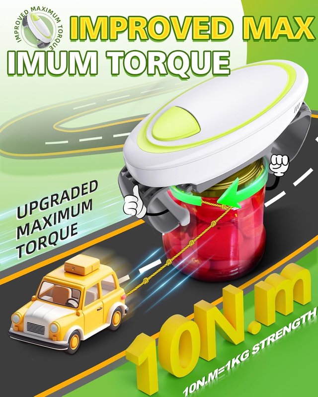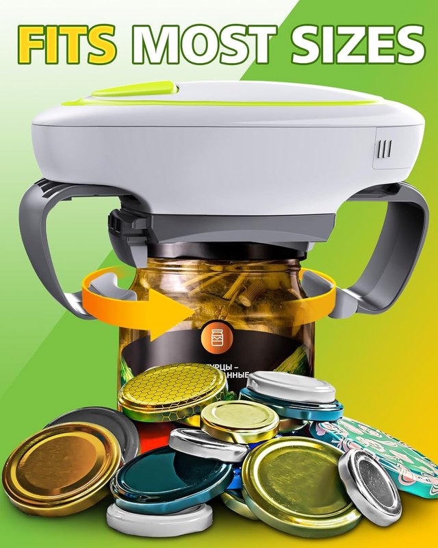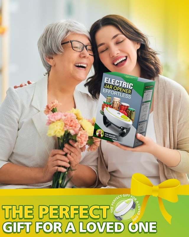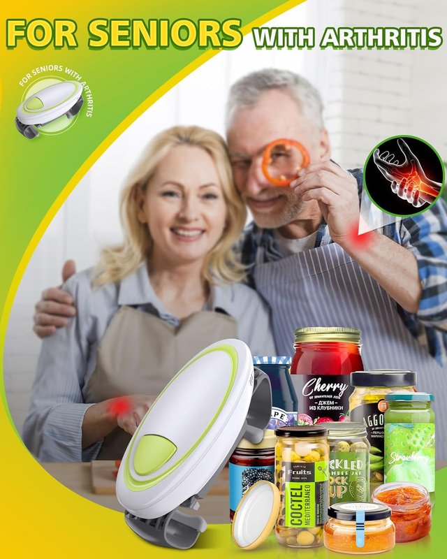 One-touch hands-free electric jar opener — designed for seniors with arthritis, weak grip or limited hand strength. Automatic motor opens any jar lid size with zero effort. Battery powered, portable and compact.