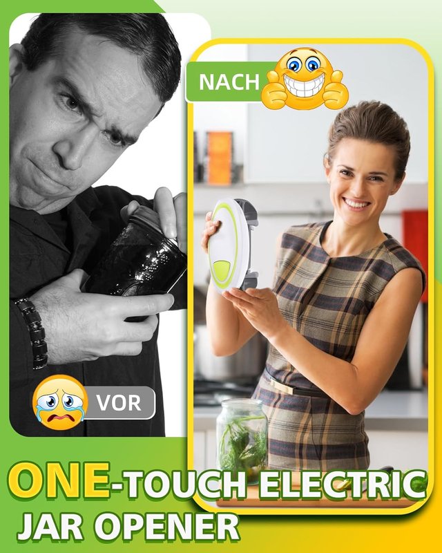 Elektrischer Glas-Öffner mit One-Touch-Bedienung — für Senioren mit Arthritis oder eingeschränkter Handkraft. Motor öffnet automatisch jeden Deckel. Batteriebetrieben, kompakt.